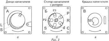 Работает центробежный гидронагнетатель следующим образом. Ротор нагнетателя приводится во вращение вышеописанным способом. Под действием центробежных сил все ролики нагнетателя плотно прижимаются к стенке эксцентрической статорной полости и начинают кататься по стенке. Эта полость является главной насосной полостью нагнетателя. Там, где ротор нагнетателя вплотную подходит к стенке насосной полости (рис. 3, б, Р1), ролики почти полностью утапливаются в направляющие пазы. Там, где зазор между ротором и статором нагнетателя максимален (рис. 3, б, Р2), центробежные ролики выступают из пазов почти на половину своего диаметра. Таким образом через впускную щель (рис. 3, а, L) насосной полости S происходит захват очередной порции бензина очередным набежавшим роликом. Эта порция интенсивно проталкивается в выпускное отверстие (рис. 3, в, М) крышки нагнетателя и оттуда вверх, через все детали электродвигателя, к выходному штуцеру электробензонасоса (рис. 1,1).