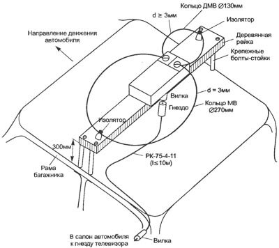 - К штекеру с помощью имеющихся на нем винтов присоединяют два алюминиевых кольца: одно -диаметром 270 мм для МВ-диапазона (каналы 6-12), другое - диаметром 130 мм для ДМВ-диапазона (каналы 23-51). Изготовленную таким образом антенну крепят к деревянной рейке сечением 3x3 см с отверстием под вилку штекера. Штекер крепят к рейке изолентой, а кольца — с помощью двух изоляторов для придания системе жесткости. Рейку крепят болтами к раме багажника, расположенной на крыше автомобиля. С помощью типового промышленного кабеля (вилка-гнездо) РК-75-4-11 антенну подсоединяют в заднем салоне автомобиля к автомобильному телевизору.