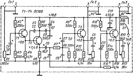 - На рисунке приведена принципиальная схема формирователя двухполосиого сигнала на четырех высокочастотных малошумящих транзисторах. В зависимости от соотношения сопротивлений резисторов R7, R15, конденсаторов С8, С6 частота разделения полос может находиться в пределах 105—8670 Гц. При этом крутизна спадов характеристик на частотах раздела составляет 12 дБ на октаву.