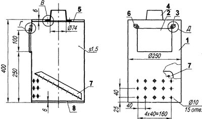 - 1 — обечайка (стальной лист s1,5, бочка из-под краски);