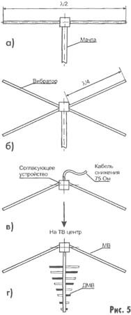 - Если дальность приема не более 50 км, то можно применить простейшие стержневые антенны. Самая простая из них — полуволновый вибратор (рис. 5, а)