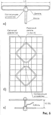 - получил широкое распространение по причине более жесткой конструкции по сравнению со стержневым полуволновым вибратором. Его разновидностью является рамочный диполь (рис. 6, б, в), состоящий из двух раздвинутых полувибраторов и сетчатого рефлектора, усиливающего прием сигналов со стороны диполя и ослабляющего прием с обратной стороны. Сетчатый рефлектор размещен на расстоянии 0,15 X от вибратора.