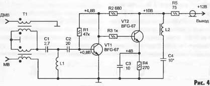 - видно, что суммирование сигналов MB и ДМВ осуществляется с помощью специального входного трансформатора Т1, а усиление общего сигнала —двумя транзисторами BFG-67, аналогичными отечественным транзисторам КТ371А. Особенностью этого и всех других подобных усилителей является то, что питание постоянным током напряжением 12 В производится по кабелю снижения через развязывающий фильтр, установленный в дополнительном выпрямителе, принципиальная схема которого приведена на рис. 5.