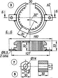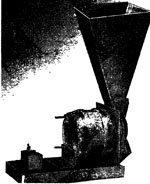 - Разработка выполнена на базе электродвигателя стиральной машины. Статор измельчающего механизма взят из муфты синхронизатора коробки передач автомобиля ГАЗ-53, в которой вырезано два окна: вверху входное сквозное и внизу выходное на глубину 30 мм. Внутри к муфте приварена направляющая пластина, а снаружи — две проушины для крепления крышки Сама муфта приварена к опорной пластине, в которой сделано отверстие для вала электродвигателя На последнем с помощью шпонки закреплен ротор, представляющий шестигранник.